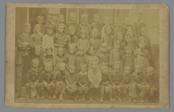 Curator: This gelatin-silver print, taken sometime between 1850 and 1890, offers a glimpse into life on Marken, a former island in the Netherlands. Titled "Groepsportret van kinderen in klederdracht te Marken"—or "Group Portrait of Children in Traditional Costume in Marken"—it presents a cluster of young children posed stiffly in their everyday attire. Editor: They look so serious! Almost as if their childhood had already been stolen from them, don't you think? A sea of somber little faces gazing directly into the lens… Curator: Certainly, the photographic conventions of the time contribute to that effect. But consider the socio-economic context. Marken was quite isolated; its inhabitants preserved a unique traditional culture for a long time. This photograph documents not just clothing, but a whole way of life on the verge of significant change due to increasing connection with the mainland. Editor: Yes, it’s fascinating to observe. Look at the textures - the roughness of the cloth contrasting with the fragile beauty of their small faces... It reminds me a little bit of certain landscapes in Dutch Golden Age painting where nature speaks as much as people. I imagine those wooden clogs thumping on the cobblestones. Curator: Indeed, genre painting, a form of capturing everyday life was developing further through mediums like photography. Think of it, not merely as a representation of a particular location and people, but a commentary of sorts: On progress, isolation, tradition. The artist, Andries Jager, subtly frames this turning point. Editor: Do you think Jager wanted to capture posterity and to tell these kids “This is what defined your parents!” A heavy burden on those small shoulders. Also I imagine a silent agreement in that period “Smile? In photography? Never!" Curator: It’s true, they are serious portraits of another time. The lack of spontaneity lends a certain gravity that resonates, reminding us that every image is more than merely a captured moment, it's a cultural artifact. Editor: Exactly, it stirs something in my heart… I wonder what those kids felt that day? The photograph makes you wonder and think and dream, to ask the right questions to history. Curator: Indeed. Thanks for this introspective viewing! Editor: My pleasure! It made me feel a lot and it made me understand more.