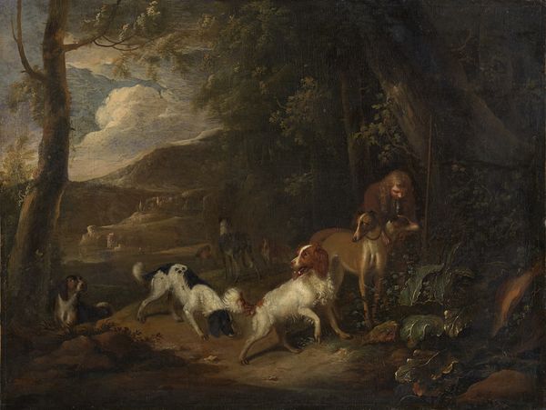 Curator: Thomas Woodward’s “Horses Surprised by Wolves” at the Tate—note the dimensions, over a meter wide. A dramatic, almost theatrical scene unfolds before us. Editor: Indeed, the eye is immediately drawn to the swirling chaos. The composition, while dynamic, feels almost operatic in its staging of panic. Curator: The painting speaks to the pervasive anxiety around class and power dynamics in rural 19th century England. The horses are a symbol of wealth being threatened by the wolves—representing the ever-present danger to privilege. Editor: I see your point, but I'm more struck by the formal elements. The artist's brushwork, particularly in the rendering of the horses' musculature, lends an almost tangible sense of energy and fear. Curator: And that fear reflects the vulnerability of the landed gentry. The wolves aren't just wolves. They are the embodiment of social upheaval. Woodward highlights the precarity of power. Editor: Perhaps. But the focal point remains the interplay of light and shadow, and the contrasting textures—the smoothness of the horses' coats against the rough bark of the fallen trees. Curator: Well, whatever our interpretation, I think this painting’s enduring legacy lies in its depiction of a society on edge. Editor: I agree. And perhaps its technical skill elevates the scene beyond a mere historical document to a timeless exploration of fear.