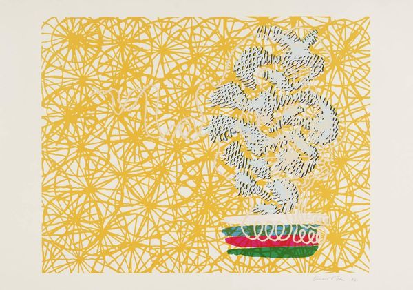 Keith Haring made Fertility Suite at an undetermined date with screenprinting. The first thing that hits you is the graphic punch of it all. Haring's not messing around with subtle shades here; it’s bold, flat color all the way. It’s like he’s saying, “Here’s the idea, bam! Take it or leave it.” Those flying saucers, that pyramid zapped with green energy, the little figure with the pregnant belly—it’s all so direct, yet so weirdly playful. And the screenprinting – it gives everything this slick, almost mechanical feel, which is wild when you think about the subject matter. It's like he's taking something ancient, like fertility, and throwing it into a sci-fi blender. There's something about the dots on the pyramid, like a pattern and then these weird rays pointing up and out that gets me. It reminds me a little of Miró, who used symbols in his work too, but Haring brings this whole street-smart, pop-art sensibility to it that’s all his own.
