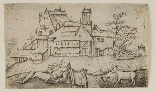 Curator: Immediately, I'm struck by this incredibly detailed rendering, like an otherworldly, sun-drenched dream. What is it about this that pulls you in? Editor: This artwork, entitled "The Old Shepherd Lying in a Landscape," dates from around 1500 to 1515, an etching attributed to Giulio Campagnola. Currently, it resides here at The Met. Curator: An etching… ah, you see that explains the mood. The density of the cross-hatching and the stark tonal range gives the composition an oddly unsettling feeling, despite the pastoral scene. The shepherd's figure looks… isolated, almost. Editor: Isolation, yes, I perceive that as well, although pastoral scenes were very common then. The figure of the shepherd resonates deeply, tapping into very old cultural narratives. Shepherds have, since antiquity, been symbols of moral guidance, piety, the divine will shepherding humanity, so the image resonates powerfully on a symbolic level. I find myself wondering whether that building isn’t a contemporary, for then, take on the temple. Curator: You know, it's interesting that you see those links because for me, even while seeing how shepherds evoke these classical allegories and religious meanings, he just seems so bored. And that pipe is an attribute that is also often a substitute for, erm, phallus. Do you think Campagnola sought to challenge idealized notions of Renaissance man? Editor: Challenge or… humanize? I appreciate your perception, this is just an etching on paper, after all, and easily misconstrued. It would not have been seen in a big public display necessarily. Perhaps Campagnola wished to evoke both our earthly and aspirational selves, the pipe offering a nod to the earthly. I like that tension and playful use of iconography. Curator: That really makes me rethink my initial interpretation. Now that you’ve explained Campagnola's approach to these common iconographic emblems, there's a refreshing sincerity. The whole is an amazing distillation of thought. Editor: Indeed. There's a beauty and depth here that resonates across centuries.