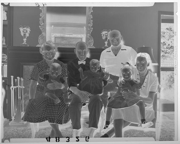 Editor: This photograph by Lucian and Mary Brown shows a family sitting on a couch. The negative image gives it an eerie feel. What can you tell me about it? Curator: This is a fascinating artifact. The image of a family, likely white, frozen in time begs the question: what narratives are being perpetuated here? Look at the carefully constructed pose, the father in a suit. This speaks to societal expectations around family, race, and class. What stories are left untold? Editor: So you're saying it's not just a simple family portrait? Curator: Precisely. Consider how such images were—and still are—used to reinforce dominant ideologies. By critically examining the social context, we can unearth the power dynamics embedded within this seemingly innocent photograph. Editor: That gives me a lot to consider. Thanks! Curator: My pleasure. It's through these critical dialogues that we can truly understand art's role in shaping our world.