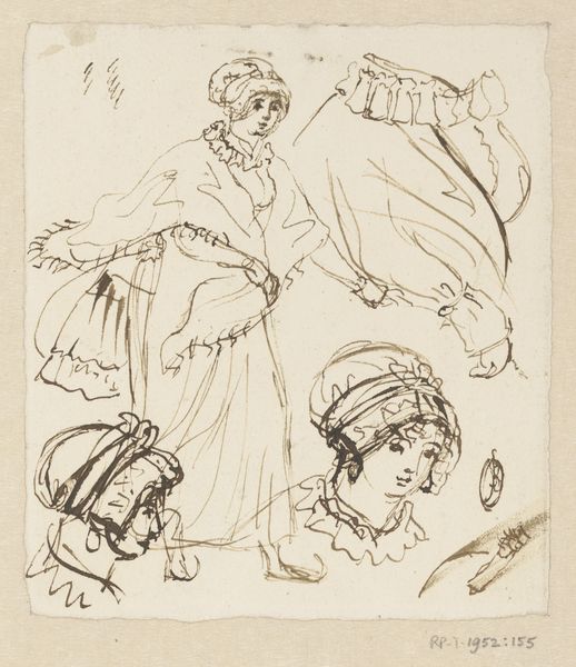 Curator: This is Cornelis Springer's "Vrouwen in Zeeuwse kostuums," a drawing created around 1856 to 1861, held here at the Rijksmuseum. Editor: Immediately, I'm drawn to the almost ephemeral quality of the sketch. The lightness of the pencil strokes and the open space create a sense of transience, as if these women might fade away at any moment. Curator: Springer, though known more for architectural paintings, was clearly captivated by the visual interest of the women's traditional Zeeland costumes. Look at how he captures their distinctive bonnets and dresses. The linearity is exquisite, isn't it? Editor: Exquisite, yes, but I also notice the almost documentarian aspect of the piece. The drawing material itself speaks to the ready availability and commonness of paper and pencil, suggestive of studies undertaken from everyday life, a record of local garments and people. Curator: Indeed, we could read these not merely as aesthetic studies, but as valuable records of cultural dress and representation from that time. Springer used the medium of drawing with its inherent emphasis on line to record detailed observations. Editor: And that labor of observation and recording deserves highlighting. Each stroke embodies not only a representation, but the very physical act of seeing and then transcribing by hand. There’s something profoundly human in that. We also get the sense he captured women working at laborious daily tasks in traditional clothing, so it's important to remember those tasks aren't visible on the page. Curator: I appreciate your bringing the labor and social context to our attention. Viewing this sketch now I have a renewed appreciation for Springer's rendering. The linear design helps emphasize the figures of the women. Editor: Ultimately, a small page, yet such rich content in terms of technique, the means of art creation, and reflections on a specific cultural context. Curator: Thank you for that important emphasis.