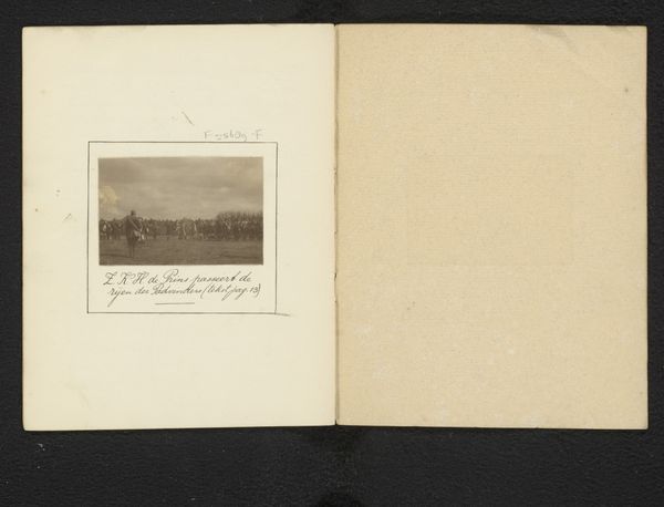 Editor: So, this is "Roeiers met toeschouwers op de roeibaan," a photograph by Albert Londe, created before 1888. It looks like an albumen print pasted into a personal sketchbook. The aged paper gives it such a nostalgic feel. What catches your eye when you look at this? Curator: The intimacy of it. We often see finished photographs displayed formally, but this glimpse into what feels like an artist’s personal journal, a visual diary of sorts, is special. You see the world as Londe saw it. There is also a tension of time. This is a fleeting moment frozen in a very deliberate, almost permanent way within this book. Makes you wonder what other secrets this sketchbook holds, doesn’t it? Does the facing page relate? Are those notes Londe’s own? Editor: That's interesting, I hadn't really thought of the “permanence” side. What about the composition? The trees lining the river bank…they remind me of Impressionist paintings. Curator: Absolutely! Londe was active during the rise of Impressionism. I love the use of light here, even in the restricted tones of the albumen print. You get a sense of the sunlight reflecting off the water and illuminating the rowers. Also notice how the focus softens with distance, creating an almost dreamlike quality. The crowds along the shore hint at the spectacle of the race itself. Tell me, what feeling does that soft focus bring to you? Editor: It’s almost like the image is dissolving into a memory…fragile, precious. And looking closer, the opposing page actually has handwritten notes! Thanks, I am paying more attention to photography. Curator: Indeed. I am thrilled to look more carefully and thoughtfully in my future museum visits too.