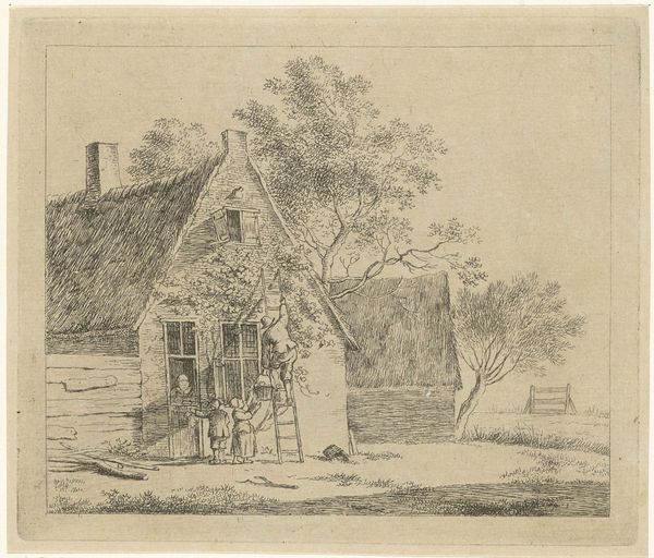 Editor: Here we have "Boerderij met erf," or "Farmhouse with Yard," an etching made in 1783 by Johannes Janson, here on display at the Rijksmuseum. It feels so grounded and calm to me; you see the workers maintaining a farmhouse under the sun, and yet the image seems to reach beyond that single moment. What do you see in this piece? Curator: Grounded is a perfect word. I find myself pondering the beauty in the everyday. There's a story being told here, isn't there? The thatched roof, the family tending to the exterior, and even the grazing cows beyond that simple wooden fence… It speaks of self-sufficiency and harmony with nature, which are concepts close to my heart. It whispers of simple lives in complicated times. The texture achieved through the etching, you almost feel the roughness of the farmhouse wall under your fingertips, no? What grabs *you* particularly? Editor: You're right, it does communicate a profound sense of self-sufficiency, perhaps as a conscious aesthetic or philosophy. I suppose the human element does draw my attention, though. I notice the interplay of light and shadow on their forms, almost as if they are props on a theatrical stage. Curator: Ah, a stage! I like how you see it. This domestic space framed as performance space; maybe that is exactly what life *is*. And there *is* a certain artifice, isn't there, in presenting a rustic ideal? It isn't the whole picture, of course, and it cannot be. But that is also part of art’s charm. What do you think? Editor: Yes, perhaps this etching offers not just a scene but an idealized version, prompting me to question those representations we create. Thanks, this was very enlightening. Curator: Likewise. A journey to self-sufficiency begins, oddly enough, with questioning!