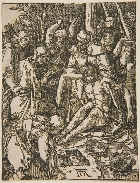 Editor: So, this is Hans Baldung's woodcut, "The Crucifixion." It's powerfully intense, a small but mighty piece. What do you make of its raw emotion? Curator: It’s like Baldung's ripped open a vein and bled emotion onto the woodblock, don't you think? The figures are contorted, expressions agonized. What do you feel when you see such a visceral scene rendered with such stark lines? Is it beauty? Terror? Editor: Definitely a mix of both. It’s unsettling, but I can’t look away. What do you notice first? Curator: Oh, always the sky—the heavens wrestling with the earthly drama below. Then, my eyes dart through the figures, a chaotic ballet of grief and cruelty. What sticks with you after a longer look? Editor: The details, probably. It’s made me think a lot about the power of the artist to make you feel like you are really there.