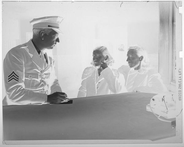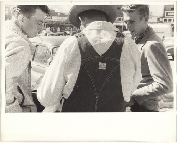Editor: Here we have an intriguing untitled photograph by Jack Gould depicting three men in hats. One man's hands are in another's coat. The composition strikes me as quite unusual. What do you see in this piece? Curator: The visual interplay between the figures is compelling. Consider the textural contrast of the fabrics and the geometry of their placement. How does the tonal range contribute to the overall dynamic? Editor: It does seem to emphasize certain areas and de-emphasize others. So the photographer is guiding our eye? Curator: Precisely. Gould employs the medium to conduct a visual investigation into form and space. The composition and light certainly provoke questions. Editor: I hadn't considered that, but it's such a different way to think about the picture. Thanks! Curator: My pleasure. It's always rewarding to explore the possibilities of the visual language.