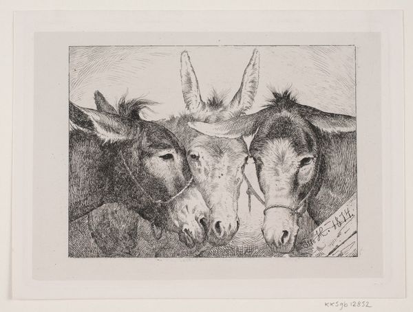 Editor: This is Julian Trevelyan's "Oxen," an etching, and it feels quite monumental despite its small size. The contrast between the solid forms of the animals and the sketchy background is striking. What compositional elements stand out to you? Curator: The dominance of the foregrounded oxen is undeniable, Editor. Note how Trevelyan employs hatching and cross-hatching to model their forms, creating a dynamic interplay of light and shadow. Editor: Yes, the texture really does bring them to life! It's almost sculptural. Curator: Precisely! The linear quality of the etching, combined with the tonal variations, constructs a compelling visual tension. What do you make of the spatial ambiguity? Editor: It makes the oxen feel almost dreamlike, set apart from reality. I see that now. Thanks! Curator: An astute observation, Editor.