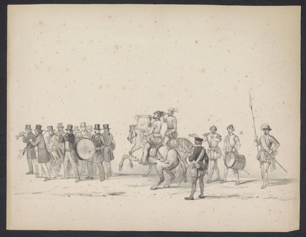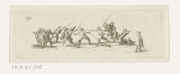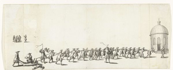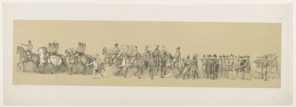 Editor: We’re looking at "Cavalcade for Departure of a Sultan" an engraving by Antonio Tempesta, dating sometime between 1599 and 1647. It feels very linear and almost frantic, so busy! I am immediately drawn to the repetitive shapes, the figures on horseback and the marching figures further along. How would you interpret the formal elements at work here? Curator: The stark contrast afforded by the engraving medium enhances the linearity you noted, which contributes significantly to the image's dynamic feel. Observe how Tempesta employs line not only to delineate form but also to suggest movement, particularly in the overlapping figures, a common strategy within the baroque. Do you notice how the texture of the line varies? Editor: I see that some lines are much darker, creating deeper shadows which I guess would contribute to the perception of depth? Curator: Precisely. This use of contrasting tones within a monochrome palette helps structure the composition and guides the viewer’s eye through the procession. We see the intentional modulation creates spatial depth in this shallow field. Note how this compositional strategy highlights the importance of line as both contour and texture. Editor: I didn't initially notice the careful variation. I was too busy noticing all the identical figures repeated. Seeing your point about line as texture helps me see how the similar elements contribute to an overall complex work. Curator: Paying attention to the details of how visual elements are carefully structured allows a richer and deeper experience. A lesson we can all appreciate.