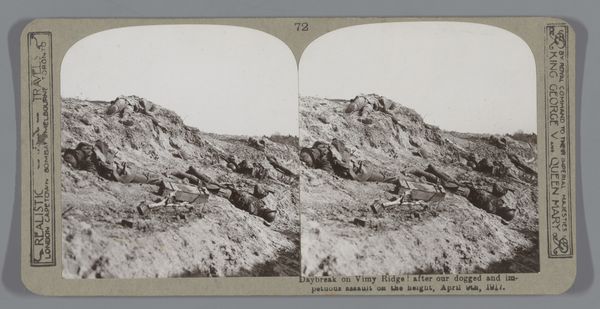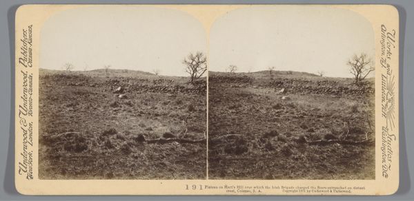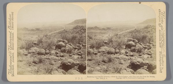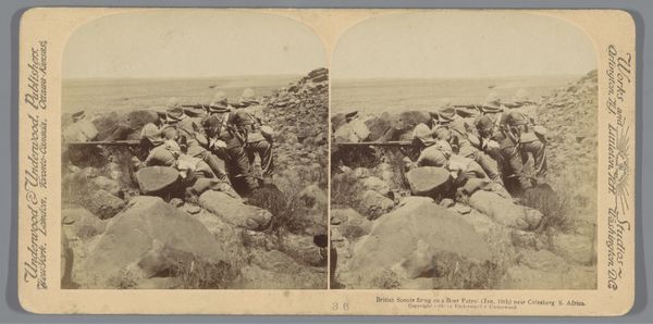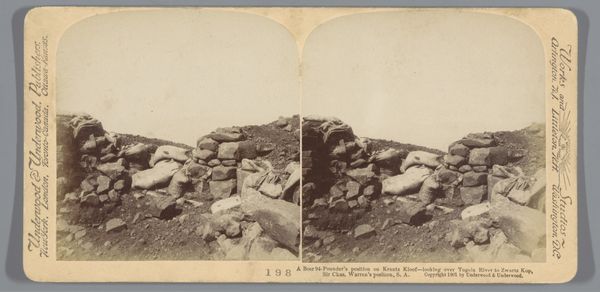 Curator: Here we have an anonymous gelatin-silver print titled “Strijdtoneel van de slag van Belmont, Zuid-Afrika”, taken around 1900. It’s a stereoscopic view of the aftermath of a battle during the Second Boer War. Editor: My first thought is of stark emptiness. The composition, with that low stone wall dominating the foreground, makes me feel incredibly small in the face of such a barren landscape. The monochrome really drives home that feeling of desolation. Curator: Yes, the symbolism of the wall is powerful. It acts as both a barrier and a marker—a testament to conflict, etched into the land. These kind of field fortifications appear in the archetypes of sieges and battlements, symbolizing human effort in response to chaos and aggression, attempts at a constructed safety, always fleeting and vulnerable. Editor: Interesting to think of it in terms of archetypes. To me, it highlights the crude, almost ad hoc, nature of warfare at that time. These are not finely crafted ramparts; just a pile of rocks providing minimal protection. It makes me think about the labor, the quick scramble to build something from what was at hand. It is a raw, utilitarian object created in immediate and chaotic circumstances. Curator: Exactly, the hurried nature of its creation speaks volumes about the anxieties of war. Note, too, how that wall bisects the scene; on one side are remnants, on the other a seemingly endless landscape, inviting consideration of time, consequences, and erasure. Editor: That connection between urgency, effort and vast time feels spot on. The choice of gelatin silver prints feels pertinent, doesn't it? The industrialization of photographic production in the late 19th century meant images of conflict were more easily disseminated. In a sense, that labor – in capturing and reproducing the scene for a mass audience – contributed to the war effort itself. Curator: Precisely! By circulating these kinds of images, certain visual ideas took root. Returning to your original thought, though: emptiness. In Eastern symbolism, for instance, emptiness represents potential – an opportunity for renewal. I find myself wondering if viewers in 1900 experienced similar thoughts, as their understanding of geopolitics shaped how they absorbed such photographic images. Editor: It’s a haunting photograph, certainly, and understanding something of its historical production allows a deeper consideration of the image itself as an act of labor and representation of labor—labor lost. Curator: A resonant observation indeed, especially considering the weight that conflicts continue to exert on culture.