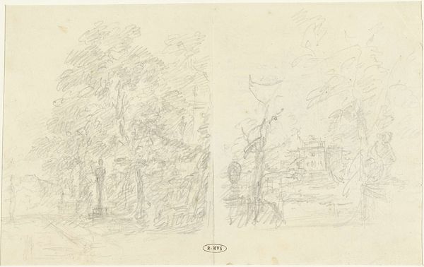 Curator: This is “Two Sketches of a Garden Landscape” by Dionys van Nijmegen, dating from the late 18th century. It’s rendered in pencil on paper. Editor: My first impression is one of delicate serenity. The light pencil strokes evoke a dreamlike quality, almost like a fleeting memory of a garden. Curator: It's interesting to consider the availability of paper and pencils during this period. Van Nijmegen, being part of the artistic circles influenced by Neoclassicism, had access to these materials through burgeoning trade networks, marking a shift in artistic production and the rise of preparatory sketches. Editor: Yes, and the composition itself – the division into two distinct scenes, each with its own focal point – it leads the eye on a specific journey. Notice how the artist utilizes framing with trees and architectural elements? Curator: Absolutely. And the very act of sketching—quick, informal—reflects a shift in the artist's role. It becomes less about commissioned masterpieces and more about exploring ideas, capturing the fleeting beauty of a landscape. Was the paper handmade, laid, or wove? What was the artist trying to create and where did he get his supplies? Editor: The lack of detail also contributes. These aren't polished, finished works but more suggestions, which pulls us in, lets us fill in the blanks and construct our own imagined spaces. The weight and arrangement create balance as we perceive these structural spaces. Curator: The formal gardens represented hint at the social context of the time. Landscape design reflected hierarchies, a controlling hand over nature—something Neoclassicism celebrated but which also began to be challenged as industrialism impacted land and lives. These sketches become documents of land use. Editor: But even within that control, the sketches themselves breathe. The way the pencil dances across the page—you sense the artist's hand, their quick observations. Curator: Indeed, this glimpse behind the scenes reminds us that the artistic process and access to its components – pigment, supports, patrons – are just as much a part of the art as what’s visibly depicted. Editor: Precisely. It really changes the experience once you've peered beyond what first catches the eye. It offers a greater and greater respect to the artistry as time goes on.