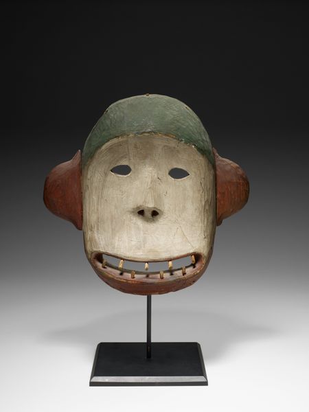 Editor: This captivating Maskette, carved from marble around 550 to 900 AD, has a distinct presence. The cool, green marble gives it a sense of serenity. What layers of meaning do you find embedded within it? Curator: The material itself speaks volumes. Jade and related stones were more valuable than gold to the Maya, often linked to life, fertility, and power. Note the meticulous carving. The even, geometric features of the face are stylized and mask-like, representative of deities or ancestors, reflecting idealized versions of the past, not portraits in the modern sense. Editor: So the evenness is deliberate, not simply a result of artistic interpretation? Curator: Precisely. This symmetry speaks to control, a face carefully curated for posterity and veneration. How do you interpret the placement of the eyes, those closed or downcast lids? Editor: I'd say it creates a sense of inward reflection, maybe meditation, or a connection to the spiritual world? Curator: An insightful observation! Think about how the mask’s smooth, cool surface might feel to the touch. What stories does it hold? It’s a window into a belief system very different from our own, a system where objects like this were active participants in rituals, symbols with enduring cultural memory. It's not simply art, but embodied history and spirituality. Editor: I've gained a new appreciation for the deliberate choices that contribute to the cultural and symbolic meaning behind a Maya artwork. Curator: And that's the power of icons, isn’t it? Their resonance stretches across time and cultures.