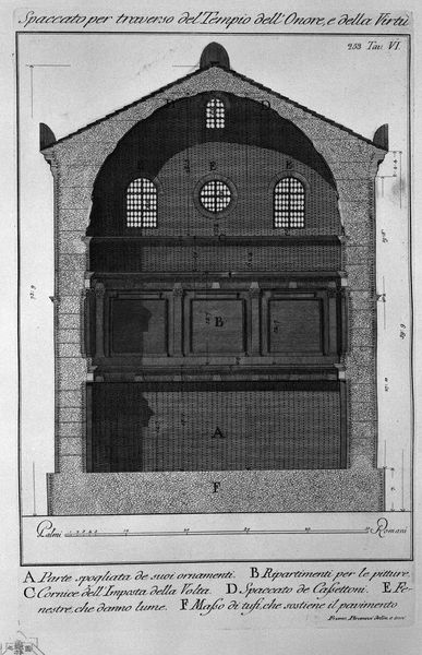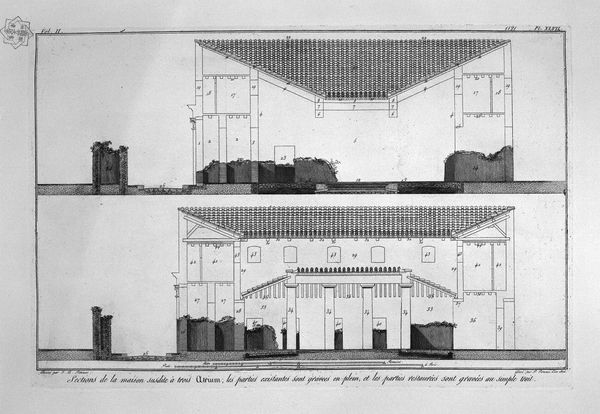 Giovanni Battista Piranesi made this etching titled 'Plan, elevation and details of Doric temples in Greece' after Le Roy. Piranesi’s print presents a visual deconstruction of classical Doric temples through a series of architectural plans and elevations. The composition is carefully arranged, contrasting the flat, graphic quality of the plans with the more detailed renderings of temple facades. The stark black lines against the white paper create a graphic tension, which is characteristic of Piranesi's style. Each line and shape serves as a signifier, pointing to a deeper understanding of architectural form and its cultural significance. The meticulous detail invites a semiotic reading, where each element—column, frieze, or capital—functions as a unit of meaning within the broader language of classical architecture. Piranesi challenges the viewer to reconsider fixed notions of classical beauty. The emphasis on structural elements and their interrelationships underscores the idea that architectural form is not merely aesthetic but also a complex system of communication.