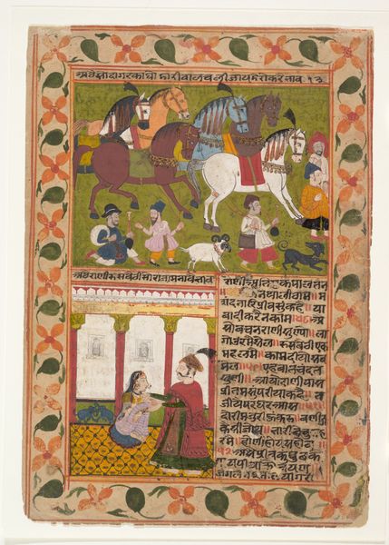 This leaf from a Kalpa Sutra, a Jain book of rituals, likely created around the 4th century BCE by Bhadrabahu, presents a fascinating interplay between text and image. Notice how the horizontal bands of script, delineated by red lines, create a structured rhythm across the surface. Interspersed within this textual grid are circular motifs and rectangular panels, framing figures rendered in a schematic, almost abstract manner. The limited palette, dominated by red, blue, and ochre, further emphasizes the formal qualities of the work. This organization reflects the Jain philosophy that reality is structured by layers of meaning. The script, with its precise lettering, embodies a quest for knowledge. The geometric shapes, like mandalas, suggest deeper spiritual orders. Together, these elements offer a system of signs which invite the reader to decode the nature of the cosmos. Ultimately, the visual structure of this leaf is not merely decorative; it functions as a microcosm of Jain cosmology, providing a framework for understanding the universe.