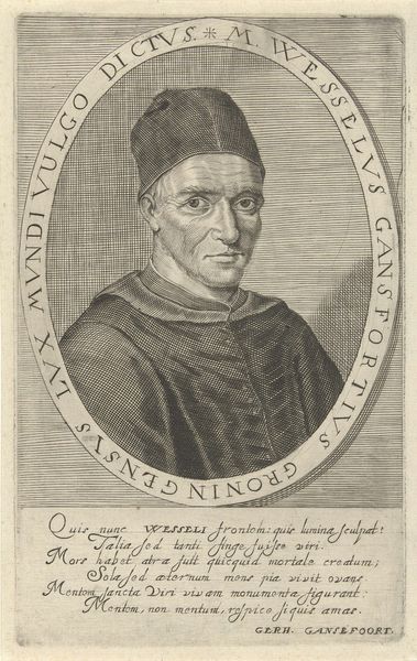 Editor: Here we have an engraving titled "Portret van Giovanni Matteo Giberti", circa 1700-1749. It's housed here at the Rijksmuseum. I'm immediately struck by the intensity of his gaze, and that commanding gesture. What do you see in this piece? Curator: It has that Baroque boldness, doesn’t it? Beyond the subject’s undeniable authority, I find myself drawn to the meticulous details achieved through engraving – all those tiny lines building up form and shadow. It's almost paradoxical; such a detailed rendering within a fairly rigid framework of the oval portrait. I can't help but wonder about the cultural value placed on representation. Editor: That’s interesting… a tension between freedom and formality. Did the constraints of the medium – engraving – limit the artist's expression or perhaps amplify it by making every mark so deliberate? Curator: Precisely. Think of it this way: engraving is inherently unforgiving. Each line is a commitment, demanding careful planning. Yet, within that structure, the artist crafts an intensely personal statement about power, knowledge, and, perhaps, the sitter’s inner world. Do you see a hint of vulnerability despite that commanding gesture? Editor: I think so… There is a sort of weariness etched on his face. Now, that you mention it, maybe the formality almost emphasizes the humanity. I never thought I would see so much emotion in such formal work! Curator: That’s the magic, isn’t it? Finding the whispers of humanity within the grand pronouncements. It makes you think differently about people. Editor: Definitely gives a whole new spin to history… you see a man, rather than just a title. Thanks! Curator: My pleasure. That is what Art does! It enables seeing and feeling from a very specific place.