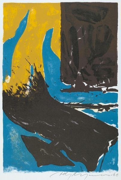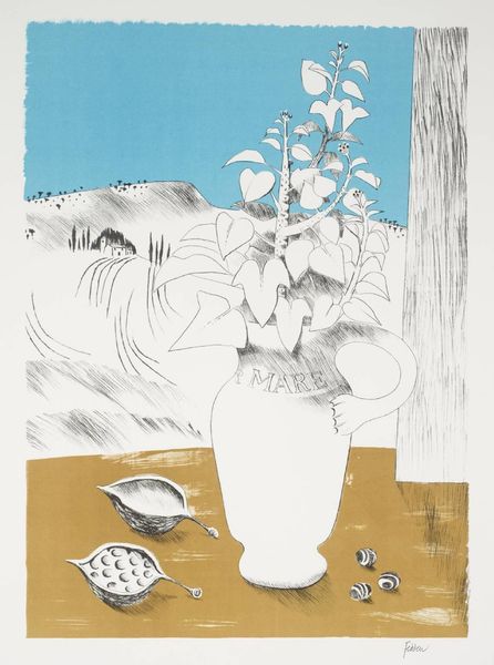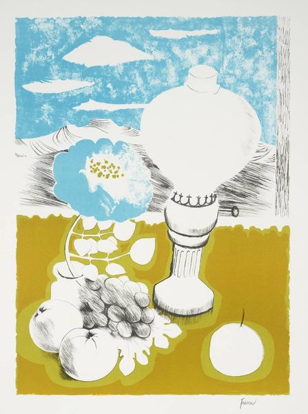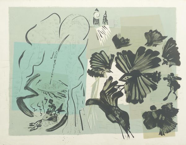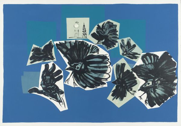 Editor: Ceri Richards' "Information Report, XVI" presents a compelling image. I'm struck by the contrast between the stark black roses and the cool blues of the background. How do you interpret the symbolism at play here? Curator: The black roses, traditionally symbols of mourning or farewell, clash with the fluid, almost watery blues. Consider how these visual cues might trigger a cultural memory of loss or transition, perhaps juxtaposed with a sense of flowing, continuous renewal suggested by the water imagery. What emotional weight do you think this contrast carries? Editor: That tension between loss and renewal really resonates. I hadn't considered the water as a symbol of renewal, but it makes sense alongside the roses. Curator: Exactly. It's through these juxtapositions that Richards builds layers of meaning. The imagery is both personal and deeply embedded in broader cultural understanding. Editor: I see the piece differently now. It's a complex interplay of symbols. Curator: Indeed. It showcases how seemingly simple images can hold profound cultural and emotional depth.
