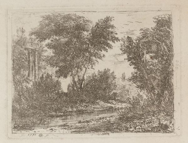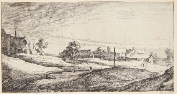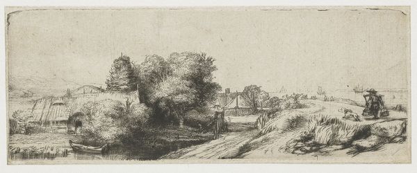Curator: Here we have Rembrandt van Rijn's etching, "A Peasant Carrying Milk Pales," created around 1650. It’s a fantastic example of Dutch Golden Age printmaking. Editor: It’s really quite a humble image. There's a beautiful sense of texture despite the limited tonal range. I can almost feel the coarse dirt road. Curator: Indeed. Rembrandt's etchings often elevated everyday life. This seemingly simple scene reveals a great deal about the rural context in which Rembrandt worked, providing insight into the lives of ordinary people through a new lens. The milkmaid likely represents the labor force in Amsterdam’s ever-expanding food supply chain. Editor: Exactly! Look closely at the marks; they're not just descriptive. They speak to a direct, almost visceral engagement with materials. This wasn’t just observation; it was hands-on work translating that experience onto the copper plate using mordants and careful timing. We should always be mindful of labor. Curator: The placement of the peasant at the periphery draws our eye across the image towards the horizon, offering a perspective that's less focused on the individual and more on the larger societal picture. It highlights the role of rural laborers within Dutch society. Editor: Agreed, but think about what it means to portray work. The image becomes both a record of labor and, through circulation as a print, also a commodity in itself. Its meaning as art transforms its content from the straightforward realities of rural existence. Curator: It reminds us that art isn't created in a vacuum. This pastoral scene emerges from a nexus of urban consumption and aesthetic taste. It’s quite complex. Editor: So true. It’s a testament to how artistic vision is profoundly connected to the ways we produce, circulate, and consume images and things. A reminder to consider the social processes by which art gets made. Curator: Indeed, Rembrandt gives us a rich tapestry that encourages us to consider how the realities of labor and landscape fit within a growing commercial and cultural framework. Editor: And understanding that adds further dimensions to an artwork we initially might have deemed only formally interesting.
