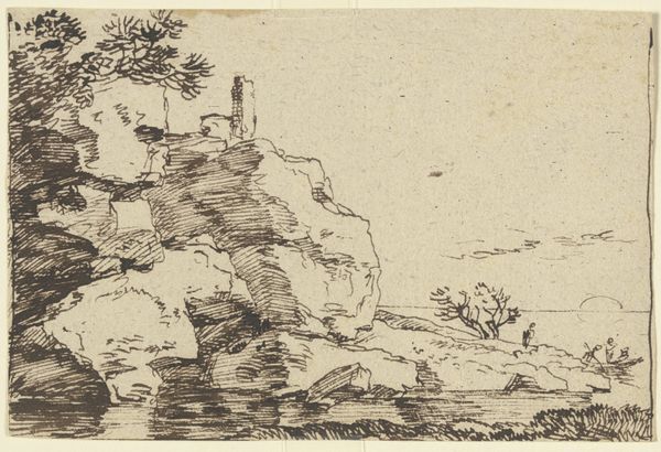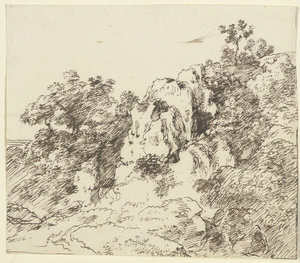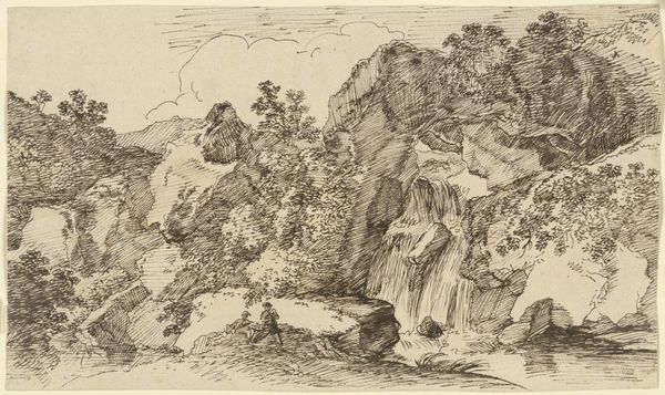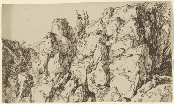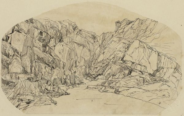 Curator: Rodolphe Bresdin's "Mountainous Site," made sometime between 1822 and 1885, using pen and ink. Quite the find here at the Met, isn't it? Editor: It looks like a fleeting memory—fragmentary. The contrast created by the ink gives it a dramatic mood despite being monochromatic. Almost oppressive with those craggy peaks looming above everything. Curator: Oppressive is an interesting take. To me, it whispers tales of nature's resilience and untamed power. Bresdin clearly revels in details. See how his lines meticulously map out every nook and cranny, every rugged rock? Editor: Absolutely, and observe the artist’s line quality. The consistent use of hatching to construct depth and shadow, yet there’s a frenetic quality. Is he romanticizing or cautioning us about nature? Curator: Ah, but that's Bresdin, isn't it? Always teetering on the edge of romanticism and realism. He doesn't just portray nature; he seems to be having a conversation with it, or maybe even arguing with it. You feel like you're eavesdropping on a very intense dialogue, if you get my drift. Editor: Yes! The dialogue extends into how the negative space balances with dense linework, guiding our eyes up. The lack of color doesn’t hinder; it intensifies the structural aspect. Curator: Indeed! I’d say "Mountainous Site" echoes that sense of wild wonder he infused into all of his art, a reminder that true beauty lies in the raw, unpolished corners of the earth. I often find that looking at his work can be strangely humbling, sort of a wake-up call. Editor: Ultimately, Bresdin makes us rethink about how line alone can be both descriptive and emotive. A landscape laid bare. Curator: Precisely. It's as though Bresdin invites us on an imaginative climb, one line at a time, through landscapes that exist as much in our minds as on paper. Editor: It really embodies a potent immediacy!