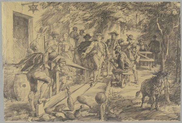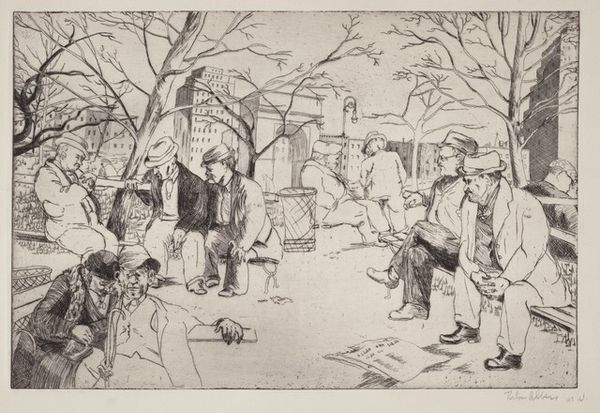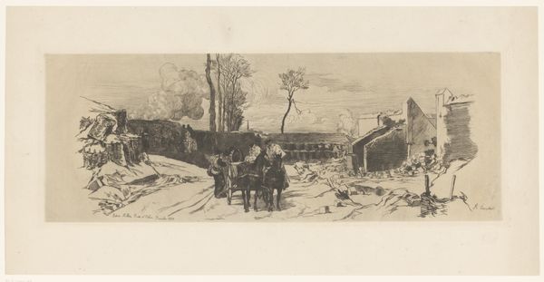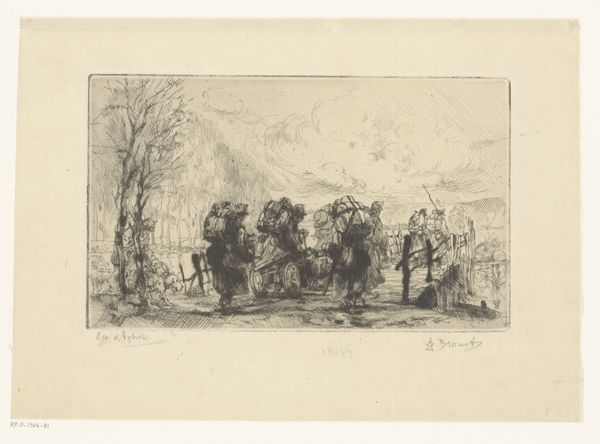 Editor: So, here we have "Straatmarkt" by Jan de Jong, likely made between 1874 and 1901, and it's an etching. It's incredibly detailed, depicting a bustling street market scene, almost a slice of everyday life back then. What strikes me is how it captures the energy, but also a kind of grit, you know? What do you see when you look at this piece? Curator: Well, I immediately think about the social function of art in depicting urban life in the late 19th century. Genre scenes like this one become really popular, not just for artistic value but for documenting and, in a way, legitimizing the experience of ordinary people in rapidly changing cities. Notice how the composition draws our eye into the market. What kinds of societal shifts do you think might make this type of imagery important? Editor: I guess as cities grew and became more diverse, it might have been a way for people to understand, or even idealize, different social classes and daily routines they might not otherwise encounter? Curator: Precisely! And etching as a print medium makes art more accessible, allowing for wider distribution. De Jong is participating in a larger artistic project of representing, and thus solidifying, a sense of Dutch national identity centered around urban spaces. Also, look at the way labor is presented; the sellers, the man pulling the cart—how does that inform your reading of it? Editor: It’s like highlighting the different roles everyone plays in this little ecosystem, but it's also maybe pointing out the economic disparity – some are vendors, others are laborers… Curator: Yes, exactly! So, looking at "Straatmarkt" goes beyond appreciating the aesthetics; it invites us to consider the broader socio-political dynamics at play and how they are represented, even celebrated, through art. Editor: I never thought about it that way. It’s not just a pretty market scene, it’s a commentary on the era, presented to a wider audience through its medium. That's a great insight. Curator: It makes you consider how the art market and socio-economic realities really do impact an artwork's production and viewing, doesn't it?