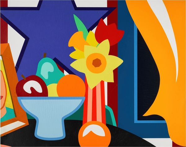 Editor: Tom Wesselmann's "Study for Still Life with Blonde," created in 1999 using acrylic paint, offers such a vibrant burst of colour. The composition is intriguing, with its mix of geometric forms and recognizable objects. What’s striking to me is how it simplifies everything into these bold, almost cartoonish shapes. What do you see in this piece? Curator: This painting is fascinating when we consider Wesselmann's engagement with consumer culture and the representation of women. This "Blonde" series is not just a pretty face. It's a statement. The hyper-simplified forms, the intense colours, and the blatant display of 'feminine' tropes – blonde hair, bright lipstick, decorative still life – all speak to the commodification of women and the mass production of desire in a Pop Art context. Editor: Commodification of women… That makes me think about the male gaze being a factor, too, perhaps? Curator: Precisely. How does this image participate in or subvert established power dynamics in visual culture? Is he critiquing these dynamics, or complicit in perpetuating them? His placement of everyday objects—a fishbowl, fruit bowl—alongside the fragmented figure forces a comparison: are women being reduced to mere objects of consumption? The artwork challenges us to interrogate these questions and to understand how images both reflect and shape our society. Editor: This changes my understanding quite a bit! It isn’t just aesthetically pleasing. Curator: Exactly! It requires us to see art as actively participating in the construction of meaning, mirroring social and political concerns. Editor: That's a very insightful perspective on this work. It's more layered than I initially thought! Curator: Indeed! Thinking critically about art’s context always enriches the viewing experience.