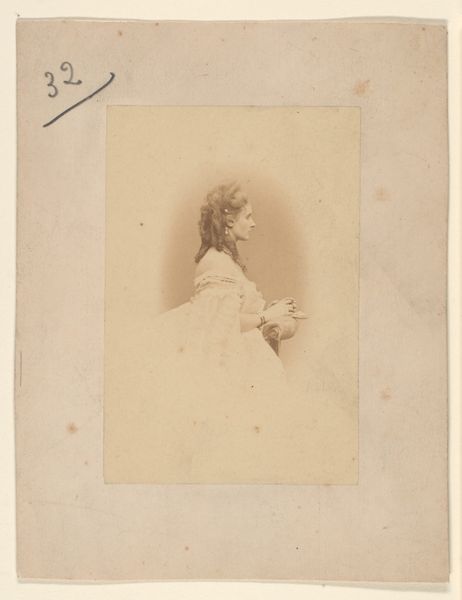 Curator: This photograph, titled "Les yeux mirés," or "Mirrored Eyes," was created by Pierre-Louis Pierson in the 1860s. It’s currently held at the Metropolitan Museum of Art. Editor: There's something spectral about it, isn't there? The sepia tone lends a soft, almost dreamlike quality to the sitter, while the lace and textures seem to melt into the background. Curator: Precisely. Pierson was known for his close association with the Countess de Castiglione, and the photographic studio's access to her facilitated significant cultural and social productions through portraiture. Editor: Yes, and if you isolate different areas to explore them in a semiotic analysis, the lace in particular is used to convey an ethereal yet worldly aesthetic, connoting ideas of romantic love, fashionable display, or material decadence depending on how you "read" the signs of that texture, pattern, light, and form. Curator: It's interesting you mention the 'reading' of signs. Photographs in this period played a key role in constructing and disseminating images of beauty and power, especially of women. De Castiglione herself understood and actively manipulated her image. Editor: Her understanding of performativity is obvious even from the posture itself. We see the intentionality. Her posture presents an artificial construct—a composition—that attempts to freeze into time an essence of the “feminine ideal” that is ever elusive and intangible. Curator: Indeed. And within courtly culture, dress signified far more than simply garments, it acted as an indication of social positioning, cultural capital and symbolic allegiance, things to keep in mind when trying to “decode” this work. Editor: And it's also the balance—or the imbalance—of light and shadow across the subject’s costume, in addition to the sepia and low saturation in its coloration that draws attention to this construction. All the textures present various light receptors across planes in the artwork's overall pictorial construction. Curator: Well, considering that 'beauty' has been weaponized for political ends, this portrait, along with others, allowed the Countess to play a pivotal role in European high society during the Second Empire, she had many influential social ties and even used them politically to influence figures like Napoleon. Editor: Thank you for sharing all of that contextual and historical significance, now the formal aspects of it ring even more clear. It just highlights the photograph’s inherent elegance and its power to convey her complex presence.
