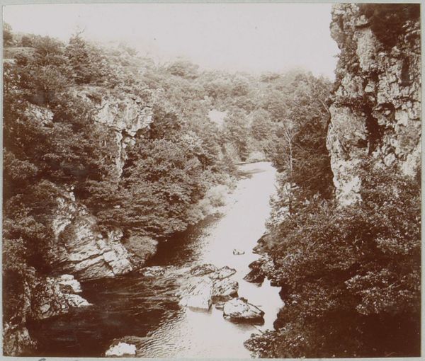 Editor: Here we have Peter Henry Emerson’s gelatin silver print, “Tissington Spires, Dove Dale,” from around 1880. It's a beautifully muted landscape. The rocks and trees lining the riverbank feel very serene and classically English. What strikes you most about this photograph? Curator: Well, what immediately stands out is how Emerson is situating himself within a very particular discourse around photography and art more broadly. He was a staunch advocate for photography as fine art. This image, like much of his work, is deliberately pictorial. Editor: Pictorial? In what sense? Curator: He employed techniques, like soft focus, to mimic the effects of painting and etching. Why do you think he might have chosen to emulate painting in photography’s early days? Editor: I suppose to legitimize it as an art form, to elevate it beyond just documentation? Curator: Precisely! Emerson was actively fighting against the perception of photography as purely scientific or documentary. He saw it as capable of conveying emotion, atmosphere, and artistic vision. Think about the broader cultural context of late 19th century England. Romanticism was still a powerful influence, with its emphasis on the beauty and sublimity of nature. This image aligns with that sensibility, wouldn't you say? Editor: I see that. So, this seemingly straightforward landscape is actually making a bold statement about photography's potential. Curator: Exactly. It's about asserting photography's place within the established art world, pushing boundaries and challenging conventions of his time. I wonder what impact Emerson has in contemporary photography? Editor: This has really made me think differently about photography from this period. Thanks!