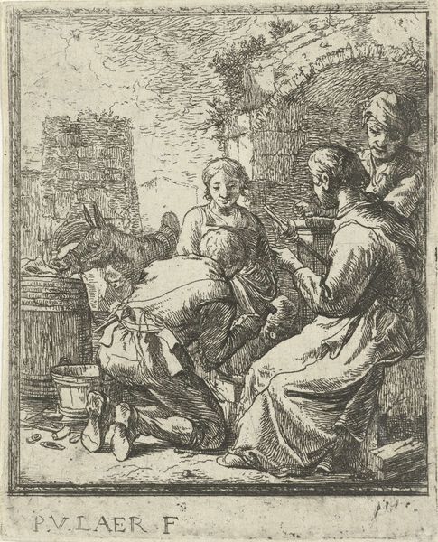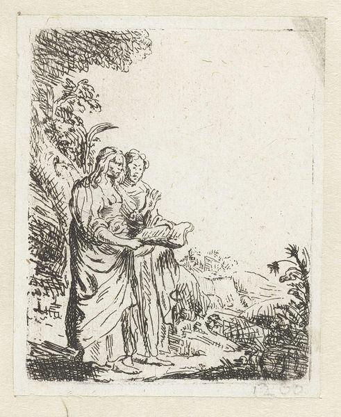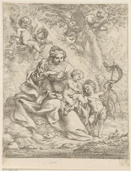 Jan de Bisschop made this print, "Musicerende meisjes in een landschap" in the 17th century, using etching. This intaglio process is achieved by covering a metal plate with a waxy, acid-resistant substance, and then scratching an image into it with a stylus. The plate is then immersed in acid, which bites into the exposed lines, creating grooves. Ink is then applied to the plate, filling the etched lines, and the surface is wiped clean. Finally, the plate is pressed onto a sheet of paper, transferring the ink and creating the print. The material qualities of the metal plate, the sharpness of the stylus, and the strength of the acid all influence the final appearance of the print. De Bisschop masterfully used etching to create fine lines, subtle tonal variations and a sense of depth. The precision of the etching process allowed for the creation of intricate details, contributing to the overall refinement of the image. By focusing on materials, making, and context, we can gain a deeper appreciation for the technical skill and artistic vision behind this print, challenging traditional distinctions between fine art and craft.