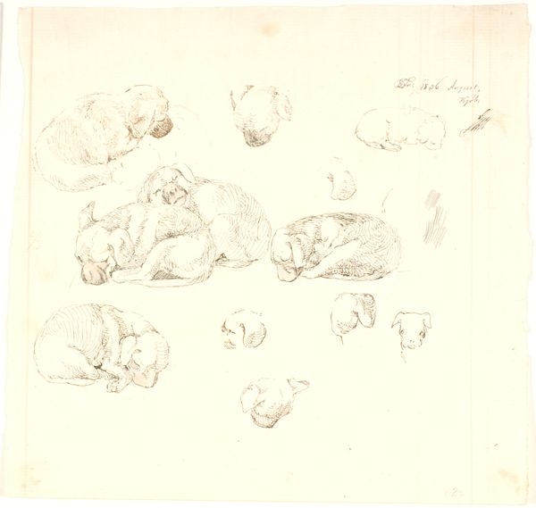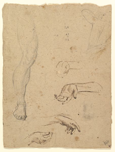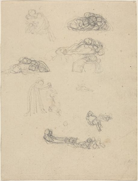 Curator: Today, we are looking at "Standing Figure in a Niche and Studies for the Ugolino Group (recto); Red-Robed Prelate in a Crowd (verso)" by Jean-Baptiste Carpeaux, created around 1857-1858. This intriguing work is currently housed at The Art Institute of Chicago and combines pen, ink, and gouache on paper. Editor: The sheer multiplicity of forms strikes me. A sense of urgency pervades, these are rapid studies teeming with raw energy. Notice the artist's process laid bare - revisions, pentimenti – all contributing to its restless mood. Curator: Precisely. The recto showcases Carpeaux's exploration of figural poses, including preparatory sketches related to his "Ugolino" sculpture. Ugolino della Gherardesca, from Dante's Inferno, embodies intense human suffering – he was imprisoned and starved to death with his sons. The clustered figures speak of torment and despair, echoing ancient tragic narratives. Editor: Yes, Ugolino embodies potent symbols tied to themes of imprisonment, starvation, and familial suffering. Dante’s influence, blending classical forms with horrific narratives of anguish. Curator: And what about the verso? A prelate among the masses. How do you interpret this choice in combination with the recto's figural explorations? Editor: Perhaps juxtaposing personal agony with societal power structures. Religious authority, represented by the prelate in his distinct robes, finds itself amidst a faceless crowd, potentially suggesting societal indifference to individual suffering, or a meditation on contrasting human conditions. Curator: That's insightful. Carpeaux clearly orchestrates a dialog between interior anguish and external realities through composition and subject. The pen work is rather interesting – crosshatching suggests not just form, but deep shadow. Editor: Agreed, Carpeaux uses line to establish compositional unity between each of the figure groups, looping them back in on each other creating a visual echo, unifying this emotionally charged image. The line conveys much – energy and tension within constraints. Curator: The layering and combining the symbolic and stylistic elements here offers a profound visual meditation on existence and despair. Editor: Absolutely, a compelling glimpse into an artist grappling with enduring human narratives.