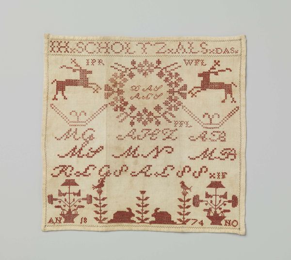 Editor: This cotton sampler from 1857, embroidered in red silk, is titled “Merklap van katoen…”. It feels like a little world, dense with images. What do you see in this piece? Curator: Well, first off, this "merklap," or sampler, isn't just decoration. Think of it as a visual language, each motif a symbol carefully chosen and rendered in thread. The animals, the figures, the floral patterns… each element carried its own cultural weight. What do these symbols suggest to you? Editor: I'm drawn to the figures – are they generic or meant to represent someone specific? Curator: Probably archetypal figures representing roles, such as motherhood. Consider the images in relation to each other, also alongside the dates and letters – what could they represent? We might also ask, “where do these motifs come from?” Editor: You mean like, were they traditional designs, or unique to the maker? The boat, for instance – is it literal, a representation of daily life, or symbolic? Curator: Exactly. Was this a coastal community, where ships played a central role? Or could the boat symbolize a journey, a life's passage, or a spiritual quest? Even the act of stitching itself carries meaning, evoking patience, skill, and the transmission of knowledge from one generation to the next. Editor: It’s amazing how much can be communicated through such simple forms. I’ll definitely look at samplers differently now. Curator: Indeed! By learning how to decode their visual language, we gain insight into the worldviews and lived experiences of those who created them. The images whisper secrets across centuries.
