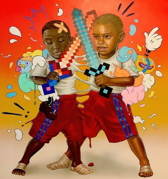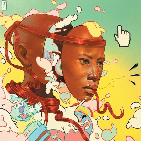 Editor: Kayla Mahaffey’s “Time Flies,” created in 2021 using acrylic paint, really grabbed my attention. There's a serious realism in the portrait's face that contrasts wildly with the cartoonish imagery erupting from… within? What is happening here? What do you see in this piece? Curator: Well, first off, that question mark hovering above the face is totally apt! It’s as if Mahaffey has peeled back the neat façade we present to the world, revealing the absolute circus of thoughts and emotions raging inside. I see nods to the anxieties and bizarre coping mechanisms that have defined the last few years: the masked figures, the manicured hand emerging to pour… is that sanitizer? But beyond the surface, to me, the work touches upon our shared humanity of inner turmoil with real wit and compassion. The tension of this work, what does it whisper to you? Editor: Definitely anxiety! And a need for some serious spring cleaning! This image feels really timely for many of us who went through major existential stress during the last few years. All the uncertainty makes the artist’s cartoon elements very approachable. Does that make sense? Curator: It makes perfect sense. The whimsical characters act like a spoonful of sugar to help the heavy medicine of the portrait go down. And what about the materials – is it right to categorize this work under the label “painting?” Editor: That’s a good point. I noticed it's acrylic, but it's not on canvas. Perhaps this piece has some relation with design works for video game or comics. It really shows in the composition with all the graphic shapes. Curator: It truly does. All right! It makes the old Renaissance debate around "disegno" and "colore" feel utterly prehistoric! Now, what did you learn while analysing it? Editor: I’ll be paying more attention to contemporary painters using those ‘new media’ composition tricks for narrative construction, like Kayla Mahaffey here! Curator: Fantastic. For me, I'm constantly fascinated by how artists grapple with our inner lives. And Mahaffey’s "Time Flies" feels like a strikingly accurate, if slightly madcap, depiction of the current moment.