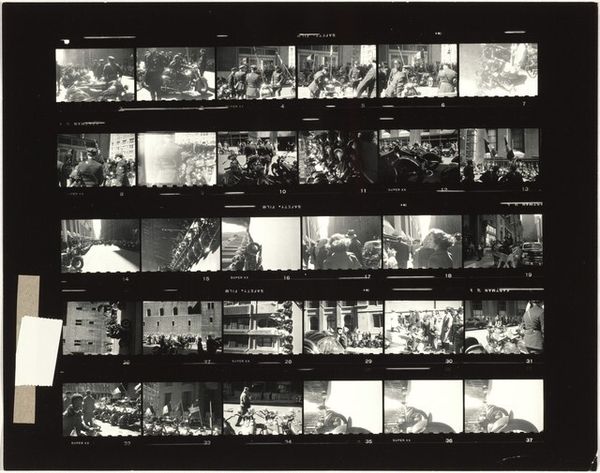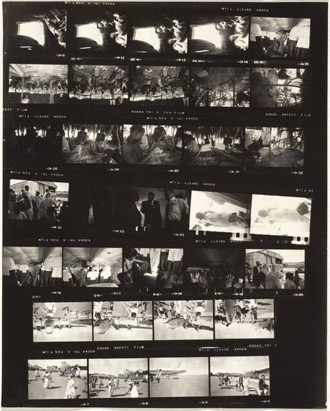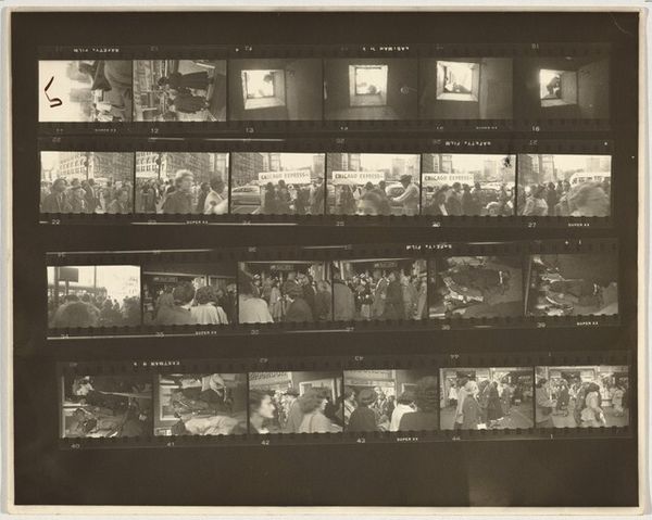 Curator: Here we have Robert Frank’s “Guggenheim 399--Las Vegas, Nevada” from 1955. It’s a gelatin silver print showing a contact sheet filled with a sequence of images. Editor: Immediately, there’s a sense of frantic energy… and almost… a claustrophobia looking at so many images crammed onto one surface. Each photograph, on its own, likely captured a distinct moment. Curator: Right, Frank documented America on the move and often captured chance encounters and juxtapositions. This particular sheet shows interior shots filled with people, as well as landscapes. We glimpse hints of signage, anonymous crowds in dark suits and hats, and glowing lights that hint at neon extravagance. Editor: I notice several close-ups of people at tables. Were these candid moments capturing labor, perhaps, or recreational consumption? Are they working or playing, spending wages or frittering it away? Curator: That’s part of the picture, I think. Frank’s genius lies in creating multiple readings simultaneously. These might be workers at a lunch counter. And the sequence as a whole conveys the intense visual clamor and the somewhat lonely atmosphere of urban American life in the mid-twentieth century. I also see that his own editing and darkroom manipulation play into this feel. He's not afraid to burn and dodge. The materiality isn't slick and untouchable, its tactile. Editor: The gelatin silver print adds to this feeling. There is no sheen; it’s quite rough. The materials speak of a working process and direct access; not of a distanced consumption or untouchable aura. The sequencing invites us into his artistic process, doesn't it? I find that compelling; art exposing art making. Curator: I think you've got it exactly. He strips away some of the mystique. I leave this image feeling almost unsettled, with a yearning for understanding something just out of reach. Editor: Exactly—by showcasing this "work in progress", it reminds me that artistic endeavors are essentially just that… ongoing, ever-evolving... processes rooted in the material world. It makes me reflect on the often-overlooked labor embedded in image making and consumption.