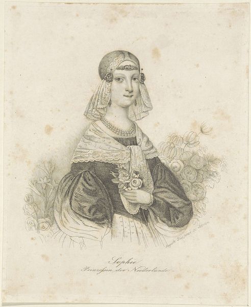 Editor: This is a portrait of Louise de Coligny, made sometime between 1834 and 1840 by N.M. Schild. It's a pencil drawing and something about the neatness of the lines and the almost stoic expression gives it an air of formality. What stands out to you? Curator: The severe formality speaks volumes, doesn't it? Notice the precise rendering of her dress and hair; consider how those stylistic choices might connect her to notions of nobility and perhaps even martyrdom, given her historical context. Editor: Martyrdom? Tell me more! Curator: Louise de Coligny was the fourth wife of William the Silent, a key figure in the Dutch Revolt. She endured much tragedy. The ribbons, the tight collar – they can be read as symbols of restraint, hinting at the personal sacrifices she made in a tumultuous time. Do you see how the artist used a delicate medium like pencil to depict such a powerful woman? Editor: I do. There’s a real tension between the soft lines and the imposing subject. It makes you think about her vulnerability, maybe? But also her strength to endure through adversity. Curator: Exactly. And the almost neoclassical frame further reinforces that association. These visual symbols and their composition create a narrative, even a psychological profile. What do you make of that very calculated choice of design? Editor: So the artist, even with just pencil, is trying to show us more than just what Louise de Coligny looked like. They’re embedding cultural and emotional information into the piece? That’s pretty profound. Curator: Indeed. By understanding those symbols, we can access a deeper understanding of both the sitter and the era. I leave thinking about how the image has shaped and solidified memory. Editor: Me too. This has made me realize just how much even a simple sketch can convey.