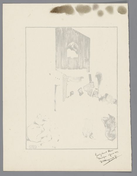 Editor: Here we have "Politieke spotprent over Bismarck, 1882," a print made with ink on paper. It looks like a political caricature from the late 19th century. I find the rigid bars visually interesting and curious to know what you make of the piece, especially its composition and symbolism. Curator: Indeed. Notice how the artist employs the stark linearity of the bars to create a sense of confinement, dividing the pictorial space. It almost operates like a stage, wouldn’t you agree? The formal arrangement draws our eye immediately to the interplay between the figures within. Editor: I see what you mean about the figures now – like characters in a play trapped behind bars. Is there significance in their gestures or the space they occupy within those defined areas? Curator: Absolutely. Consider the figure with wings, presumably Bismarck himself. His outstretched arms and commanding presence contrast starkly with the seated figure, seemingly restrained or subjugated. The ink lines themselves, varying in thickness and direction, contribute to a dynamic visual tension within the frame. Notice, how light and shadow play on these figures? The strong source emanating behind accentuates dramatic shape to emphasize specific meanings and emotions. Editor: So, by focusing on line, form, and the way figures are arranged, you’re reading the political message encoded in the visual elements of the print? It is not obvious but your points make it clearer. Curator: Precisely. The artist crafts a potent statement through formal means – the rigidity, the positioning, and the expressive linework, rather than explicit historical details. This lends the artwork a formal weight that transcends its immediate political context. Editor: That’s fascinating. I’m starting to appreciate how a close analysis of visual elements can reveal so much about an artwork’s message and its deeper, enduring significance. Curator: As am I; reflecting on these structures only deepens understanding.