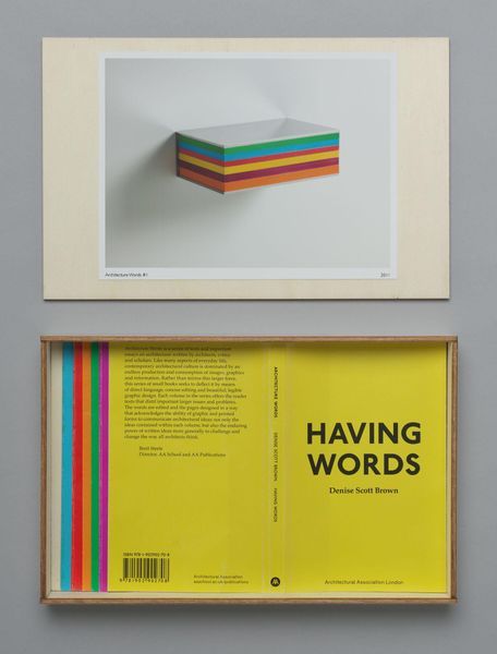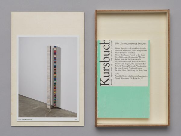 Editor: Here we have Fernanda Fragateiro's "Double Rainbow from 'Materials Lab'". It's a box construction, and I’m immediately struck by the interplay of textures and the use of color blocking. What do you see in this piece? Curator: The juxtaposition of the photographic image with the planar arrangement of colored book components is certainly compelling. Note the subtle variations in tone and the interplay of rectangular forms. How does the artist utilize the negative space within the box to create visual tension? Editor: I hadn’t considered the negative space so consciously. I was focused on the colors and shapes themselves. Curator: Precisely. Consider how Fragateiro manipulates the formal elements to engage the viewer’s perceptual experience. It’s a study in form and color relationships. Editor: It’s fascinating how a simple arrangement can reveal so much about composition. Curator: Indeed. It encourages us to look closely at the intrinsic qualities of form and spatial relations.