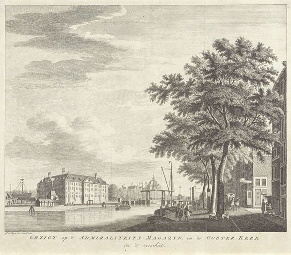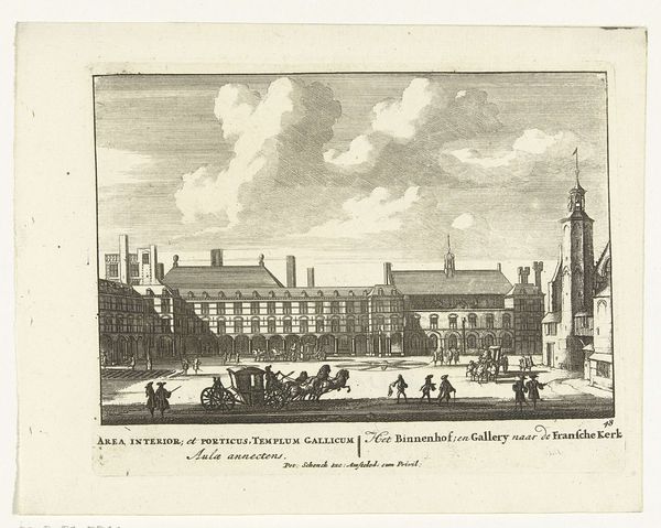Editor: Here we have Pieter Schenk’s engraving, "View of the Pond and the Court in The Hague," dating roughly between 1695 and 1705. The detail is remarkable; it almost feels like a photograph from that era. What strikes you most about this cityscape? Curator: It’s a carefully constructed image designed for public consumption. Prints like these circulated widely, shaping perceptions of the Dutch Republic's power and sophistication. Notice how the artist positions the viewer – almost like a respectful outsider looking in on the political heart of the nation. Do you see the figures promenading along the Vyverberg? Editor: Yes, they appear to be members of the elite class. The attire seems very formal, perhaps indicative of a society focused on image and hierarchy? Curator: Exactly. The artist strategically includes these figures. Prints functioned as propaganda, projecting an image of an orderly and prosperous society. Schenk doesn’t just depict a place; he reinforces the status and legitimacy of the governing class to a broader audience. The act of printing and distributing such imagery should also be taken into account, a certain politics lies within. What else do you see at play here? Editor: The very deliberate rendering of the architecture. The buildings have a kind of austere grandeur. It evokes stability and established power. Curator: Indeed. And consider where this print might have been displayed – perhaps in the homes of wealthy merchants or even in public spaces – further cementing these visual associations between the elite and the health of the state. Editor: So it is less about the individual buildings and more about what they represent in a social and historical context? I had not considered how widely distributed prints could play such a large role. Curator: Precisely. It serves as a reminder that images are always produced, circulated, and consumed within a specific set of power dynamics. This print offers insight into the early formation of national identity.
