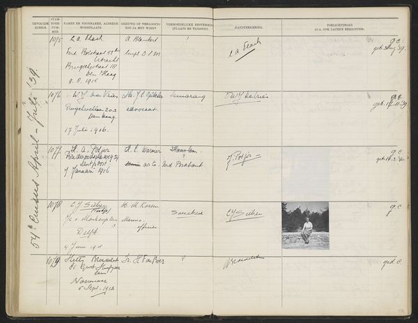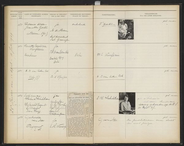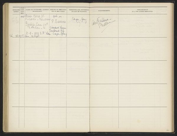 This page from a register, made by an anonymous hand sometime between 1930-1949, is filled with handwritten records using ink on paper. The density of information and the formal structure create a unique visual rhythm. It reminds me of the systematic approach of Hanne Darboven. Look at the script, the way the ink bleeds slightly into the paper, the careful yet imperfect execution. Each entry, a little world unto itself, a record of a person, their origins, and destination. The columns create a grid, but the handwritten entries resist this rigid structure, each signature has its own distinct flourish. The text appears to have been added over a period of time, and some of the ink is browner than other sections. The individual entries, like brushstrokes, combine to create a whole that is both informative and evocative. It’s a fascinating testament to the beauty and complexity found in simple, everyday forms. I see a relationship to the work of On Kawara. Both artists embrace repetition and systematic processes.