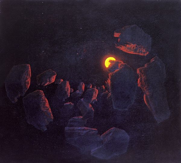 Curator: John Berkey's "If the Stars Were Gods," painted in 1981, is quite the arresting image, wouldn't you say? Oil on, presumably, canvas. Editor: Absolutely. There's an immediate sense of the epic scale here. I feel the religious tones but it is also strange, like the cover of a fantasy novel… It's got this primal scream of a reddish star, dwarfing a figure reaching out…surrounded by… are those biomechanical dinosaurs? Curator: Something like that! Berkey had a real knack for blending the organic with the mechanical, almost a premonition of steampunk, you know? He imagined futures that were less polished chrome and more… well, more lived-in. It was made for a book cover, but it is expressionistic at its core. Editor: That blending is where it gets interesting. There’s an Afrofuturist sensibility here—connecting imagined futures with a kind of primordial past and post-colonial realities, creating a counter narrative to Western canons of futurism and progress. Are the dinosaurs worshiping the human or are they mocking his worship to a dying god? The book cover is dated from 1981 during the re-theorization of feminism in postmodern philosophy. Curator: Interesting angle. I never considered the mocking part… I tend to look at these figures as symbols of humanity’s insignificance in the face of the cosmos, this vast and unknowable power out there that might as well be gods. You notice how Berkey renders the texture of the star, it pulsates right off the surface. He could bring metal and machine to life in brushstrokes. Editor: I suppose. To me, they represent a possible non-Western future, deconstructing the authority of science and technology, especially since the only human figure is portrayed in supplication to a celestial body… I see the supplication act to an all-consuming ball of fire in a different light. And what of that fire that consumes? A dying sun maybe an interesting metaphor about powerlessness… Curator: Right! So it’s not just spectacle. It has a vulnerability too, that maybe this grand deity isn’t so eternal, it can die! So you think Berkey invites a challenge to traditionally patriarchal perspectives of religion or societal system as a whole? That we might, in turn, challenge authority or authorship? It all seems rather intuitive, which can open an interpretive floodgate… Editor: It's a very useful deconstruction! You've provided the context for future creative inspiration while remaining within the traditional author-viewer relationship! It certainly gives pause to rethink canonical expectations about heroism, worship, and scale in science fiction!