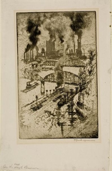 Editor: This is "The Towers of Oil" by Joseph Pennell. The plumes of smoke rising above those stark industrial forms create such a powerful, almost oppressive atmosphere. What strikes you most about this print? Curator: Well, the romantic industrialism on display here is definitely provocative, isn’t it? Pennell seemed almost seduced by the sheer scale of these oil works. The way he uses the etching to capture the billowing smoke is captivating, and yet it makes me think about the hidden costs, you know? The human and environmental impact lurking beneath the surface. Editor: That's a perspective I hadn't fully considered. So, it's not just about admiring the aesthetics, but also questioning what it represents? Curator: Precisely. Perhaps Pennell saw beauty where others saw exploitation. Or perhaps he saw both. Art’s funny that way, isn't it?