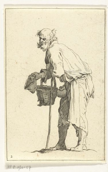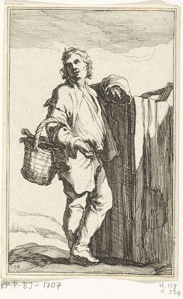 Giuseppe Maria Mitelli created this etching, "Stoelenverkoper," in the 17th century. The print depicts a figure who sells images, which are held in a basket and fanned out on sticks, for easier viewing. He holds one image up to his face, obscuring his features. In the 1600s, Bologna, where Mitelli lived and worked, was under papal rule, a society marked by strict social hierarchies, and the Catholic Church played a dominant role in daily life. This image is from a series of prints that Mitelli made representing different trades or professions. Mitelli uses the figure of the seller to explore themes of labor and commerce. The man's bare feet and modest clothing contrast sharply with the luxury items he peddles, highlighting the economic disparities of the time. The print captures a transient moment, a seller in the act of offering his wares. The Italian inscription hints at the images being tokens of love. Mitelli's print invites us to reflect on both the intimate and economic exchanges that shape our lives.