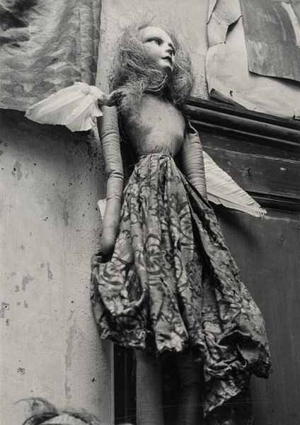 Curator: Here we have Bill Brandt's gelatin silver print, "Flea Market, Paris," circa 1930. Editor: It’s a stark image. The severe monochrome tones really evoke a feeling of desolation, and the subject matter is equally unsettling; a mannequin posed in a dimly lit setting. It feels very staged. Curator: Staged perhaps, but I would also say it provides an intriguing lens into the interwar years. Notice how the mannequin, frozen in a period-specific dress, is eerily placed amidst discarded goods. What does it mean to display it like this? I would ask what it represents about societal anxieties of the time, anxieties around value, decay and class differences as France struggled with economic recovery and the shadow of impending conflict. Editor: I see it more practically. The high contrast and dramatic lighting might be Brandt experimenting with new photographic papers or darkroom techniques available at the time. The framing feels intentional, almost theatrical. Maybe he was drawn to the texture of the fabrics. Was this staged to create something striking and unique that may elevate its aesthetic value? Curator: It is compelling, that's undeniable. Yet to detach it from its societal context strips the photograph of its real impact. The photograph has much to say about women. Brandt invites us to consider the gendered performance, as this inanimate, manufactured femininity intersects with social class and consumption within an increasingly fragmented world. Editor: Maybe. But you cannot deny the photograph’s compositional balance! The textures, how he has captured them, from the dress’s material to the chipped pavement… that alone creates the mood of decay, independent of social commentary. Curator: A complex piece with a range of potential interpretations; It urges us to confront how material culture mirrors social fault lines, a dialogue perhaps still continuing today. Editor: Absolutely, and to also look closely at what’s actually there, not only how it resonates, but the material qualities and the skill in capturing and rendering it through photographic materials.