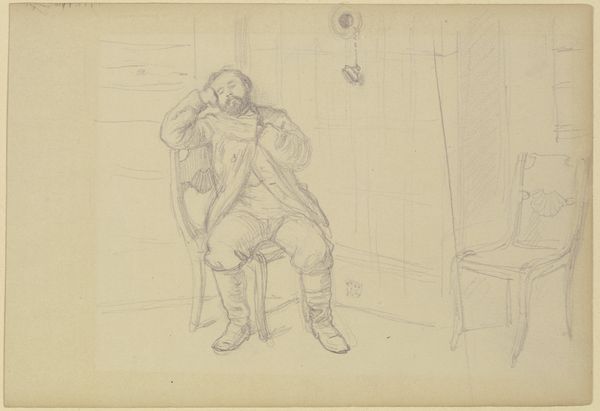 Editor: Here we see "Sleeping Man on a Chair" by William Valentine Schevill. It's a pencil drawing, and I find it incredibly poignant. The subject seems utterly exhausted. What stands out to you? Curator: The immediate interest lies in the artist's manipulation of line. Observe the contrast between the clearly defined figure and the chair, which is merely suggested. What does this imply about the subject's state, vis-à-vis his surroundings? Editor: It makes him seem very present, while the rest fades away. Almost as if he's collapsing into himself. Curator: Precisely. The artist uses varying line weights and densities to achieve this effect. Notice also the candlestick on the table. It's a stark vertical element, contrasting with the slumped figure. Editor: Yes, it's a powerful juxtaposition. I hadn't considered the formal qualities so closely. Curator: By attending to these intrinsic elements, we unlock deeper layers of meaning. Editor: I see what you mean. Thank you.