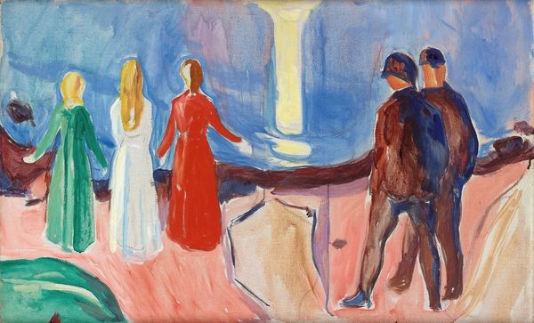 Curator: Looking at Edvard Munch’s 1935 painting, "The Lonely Ones," I'm struck by its immediate melancholic atmosphere. Editor: Absolutely. There’s an oppressive weight in the composition, wouldn’t you agree? The figures, though together, are clearly isolated from one another and even the surrounding environment. Curator: It's interesting that you say that, because Munch repeatedly returned to the motif of figures on the shore, exploring themes of isolation and human connection throughout his career. In "The Lonely Ones", notice how their inward focus makes them oblivious to each other. This image, for me, evokes something about the modern individual alienated from communal support structures, which finds root in, say, pre-Christian iconology: images of abandonment. Editor: Indeed. This painting functions as more than just a symbolic portrait; it engages with the historical narrative of shifting social relationships as modern society has formed and calcified. The raw impasto and the stark contrast in coloring only emphasize this fragmentation, wouldn't you say? And beyond, even, those material facts, there’s a clear racialized and gendered component at work here. Curator: True. You read it as such, but Munch frequently manipulated form and color for emotional resonance, building upon symbolist tropes. While a sociohistorical interpretation adds nuance, it can be argued the universal themes of loss and detachment remain core to the piece, speaking of and to conditions far outside its origins in interwar Scandanavia. Look how the landscape almost pushes in on them, mimicking the pressure of societal expectations. Editor: But aren't those very societal expectations products of their time? To look at the solitary woman cloaked in white and *not* see her positioned within a patriarchal structure feels negligent. Art becomes powerful *through* its entanglement within power dynamics. Curator: The enduring strength of an image rests upon polysemy; it speaks in myriad registers across time. While rooted in the specifics of context, artworks, at their best, transcends the limits to reveal continuities of human experience. Editor: Agreed. Understanding those complex dialogues – between individual and society, past and present – is what ultimately allows us to see ourselves reflected in these “lonely ones.”