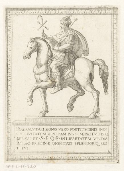 This is Nicolas Beatrizet’s print of The Equestrian Statue of Marcus Aurelius on the Capitol. Beatrizet uses line and form to capture the statue’s imposing presence. Look closely, and you'll see the texture of the horse's musculature rendered with fine, directional strokes, giving it a palpable sense of mass. The contrast between the dark hatching and the white of the page creates depth, emphasizing the three-dimensionality. The statue rests on a pedestal inscribed with text. Beatrizet's etching technique highlights the relationship between the statue and its base, suggesting a dialogue between the classical form and its historical context. The statue transcends mere representation; it becomes a signifier of power, knowledge, and historical continuity. Beatrizet's strategic use of hatching and tonal variation emphasizes the statue’s imposing form, drawing our attention to the way the artwork functions as a sign within a broader cultural and historical framework.