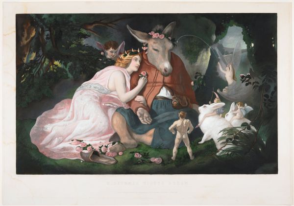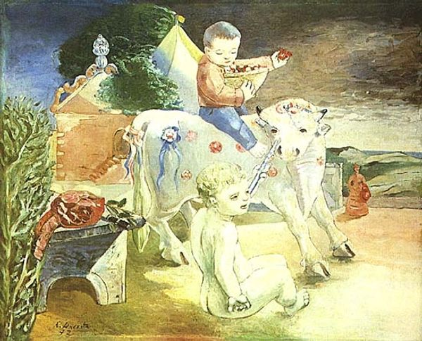 Editor: Here we have Pablo Picasso’s “Curtain for the Ballet 'Parade'”, painted in 1917. The muted colors and slightly obscured figures create a dreamy, almost unsettling atmosphere for me. What do you see in this piece? Curator: Oh, this curtain! It's pure theatrical magic, isn't it? It feels like stepping into a half-remembered dream, or maybe one of Erik Satie's eccentric compositions come to life – which makes sense, given Satie wrote the music. Imagine Picasso, in Rome with Diaghilev’s Ballets Russes, soaking up the energy. This curtain wasn't just a backdrop; it was a statement, a collision of the classical and the avant-garde. I almost sense a bittersweet reflection on tradition amidst a period of radical change… Do you feel that? Editor: I think I get what you mean by radical change, but can you say more about the tradition side? Curator: The harlequin figure for one. That character harkens back to commedia dell'arte, but Picasso gives him a modern twist. And that dreamy, almost pastoral scene coexisting with these very Cubist-esque, angular elements...it is like a stage where different eras are performing side-by-side, arguing about who gets the spotlight. And that winged horse--how surreal. It is like a child's imagination set free. Editor: It is almost as if we get an insight to Picasso playing on multiple ideas for the parade. It certainly puts things in a fresh perspective. Thanks! Curator: Absolutely! That’s the genius, isn’t it? It leaves you questioning and re-evaluating everything you thought you knew about art, ballet, and maybe even yourself. It certainly changed mine and still does today.