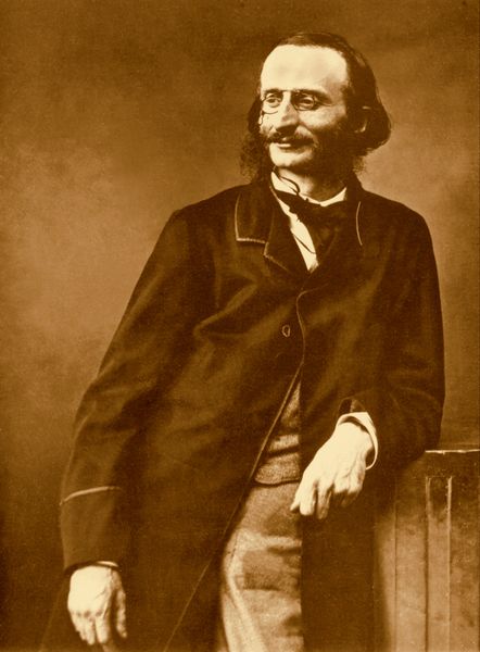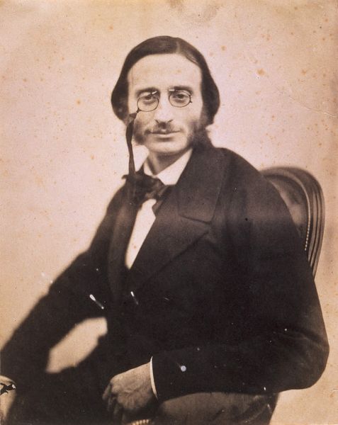 Editor: This is a gelatin silver print titled "Jacques Offenbach" by Felix Nadar. It's striking how crisp the image is despite its age. There’s almost a romantic softness, a delicate air, to this serious portrait of a man sporting a rather dashing monocle. What jumps out at you when you look at this piece? Curator: You know, it’s that monocle that winks at me! It’s a touch of whimsy against a backdrop of Victorian formality, a tiny rebellion stitched into the very fabric of the image. Nadar, that clever chap, wasn’t just snapping pictures; he was capturing souls, wasn't he? Offenbach seems to be caught between worlds—serious composer and a bit of a playful trickster! Don’t you think? Editor: I definitely see that now! It's like a hidden layer in the photograph, the subtle clue about his personality. But do you think Nadar deliberately tried to reveal that side of him? Curator: Ah, the eternal question: intent! Did Nadar set out to unveil the “true” Offenbach, or did Offenbach, the master of operetta, subtly orchestrate his own image? Photography in those days was a collaboration, a dance between artist and sitter. It leaves room to ponder how much the subjects controlled their image. Fascinating, isn't it? Editor: It really is! It makes you wonder what kind of performance each person gives for the camera. Thanks! Curator: The pleasure was mine! Thinking about art should feel this engaging every time.
