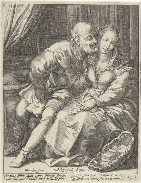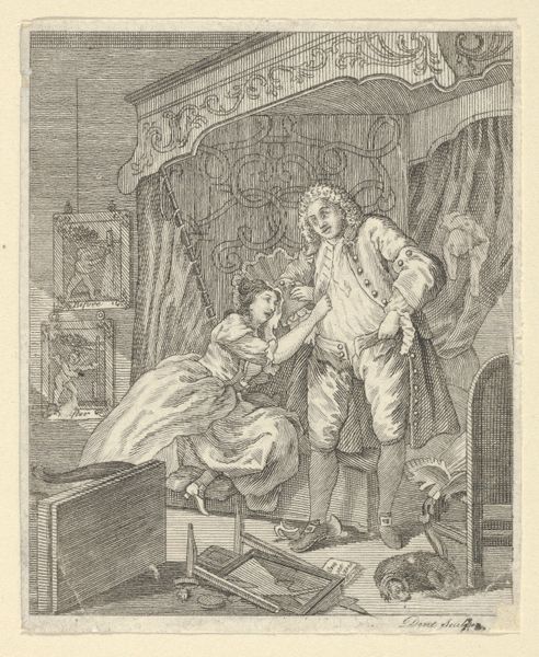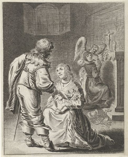 Editor: Right now, we're looking at a print called "Don Philippo en Eleonora," etched in 1643 by Pieter Nolpe, housed in the Rijksmuseum. The etching captures two figures in a rather… strange pose, I'd say. The detail is amazing, especially considering it's a print. What do you see in it? Curator: Ah, yes! It speaks of a tender deception, doesn’t it? A candlelit confession whispered close… I envision the artist himself lurking behind that curtain, breathless as he captures this little tragicomedy. What secrets do those shadowed corners conceal? Nolpe invites us into the clandestine, urging us to wonder at what is said, not just what is shown. Editor: I never considered the potential of betrayal! But I thought she looked caring toward him, not villainous. Is my reading wrong? Curator: There is always the risk in reading character into gesture... Perhaps 'caring' is another mask. The question Nolpe is prompting, I believe, isn't of right versus wrong but the space between such simple binaries. What expectations, Eleanor asks the older Don Philippo, do you think the world puts on us versus what we wish to do? The world would cast us into specific roles but what should one do to avoid this reduction? Is that not a central tenet of Baroque Art, to ask viewers to look at such a conundrum? Editor: It changes everything, framing it as social commentary rather than personal. I thought Nolpe was making comment on the age gap between them or commenting on social mores, and the world around the image, perhaps I missed all the nuance in such simple form. Curator: Art has always danced best in disguise, luring the unsuspecting in with the guise of familiarity, no? But the greatest art--art which echoes to infinity-- asks what is truly unseen, beyond the superficialities in simple representation? Thank you for pointing toward new possible interpretation... Now, what do you make of that picture behind our dueling players? A battle, perhaps, like what faces them both?
