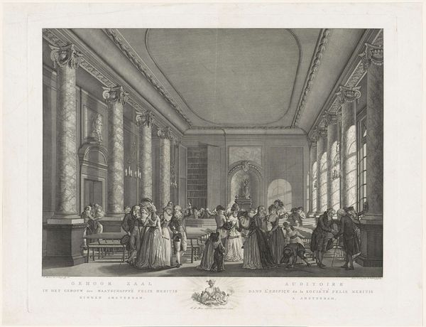 Editor: So, this print is "Gehoorzaal in Felix Meritis, 1789" by Reinier Vinkeles, made around 1794. It depicts a gathering in a grand, neoclassical hall. It's an etching or engraving, I think? The figures seem so lively and engaged, but there's also this underlying formality in the architecture. How do you interpret this work, looking at it through your specific lens? Curator: Vinkeles captures more than just a room; he distills a moment of civic engagement. Notice how the architecture itself, the ordered columns and symmetrical layout, embodies Enlightenment ideals of reason and order. But look closer. Isn't there something subtly unsettling about the precision? It almost feels staged. Editor: Staged? What do you mean? Curator: Think about the symbolic weight of classical architecture. It’s drawing on the authority of ancient Greece and Rome, projecting an image of stability and virtue. But to what end? Consider the expressions of the people. Are they genuinely enlightened, or merely performing the role expected of them in this 'hall of merit'? The composition begs us to ask: what does progress really look like? Editor: That's interesting. The almost theatrical nature of it all… almost like they are posing rather than interacting naturally. The statues become witnesses of their enlightenment... or perhaps, critics? I never really thought about how spaces dictate what occurs there. Curator: Precisely! Vinkeles prompts us to question how cultural values are constructed and performed. Every detail carries intentionality: the light streaming through windows suggests divine approval, the placement of figures subtly reinforces social hierarchies. Are these individuals participants in enlightenment, or performers within its grand theatre? Editor: Wow, I never considered it that deeply. So much to unpack there. Thanks for this insight! Curator: My pleasure. Art invites us to confront comfortable assumptions. May it continue to illuminate your own path!