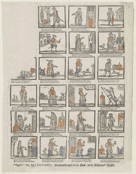 This print titled 'De vernieuwde Jan de Wasscher' was made by Erve H. Rynders in Amsterdam. Arranged in a comic strip-like format, we see vignettes of "Jan de Wasscher" or "Jan the Washer" experiencing a series of life events. Let’s consider the social history embedded in this image. The scenes depict various stages of life, from marriage to childbirth and raising children, reflecting the societal expectations and values of the time. The domestic settings and activities suggest the importance of home and family in Dutch culture. Produced in Amsterdam, a major center of trade and cultural exchange, this print provides insight into the daily lives of ordinary people in the Netherlands. As historians, we can delve deeper into the cultural context by researching Dutch social customs, family structures, and the role of printed media in disseminating ideas. By exploring these historical resources, we can uncover the layers of meaning embedded in this seemingly simple artwork.