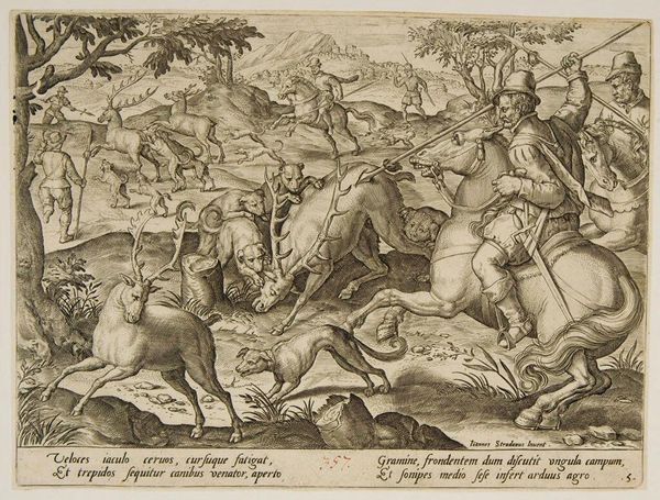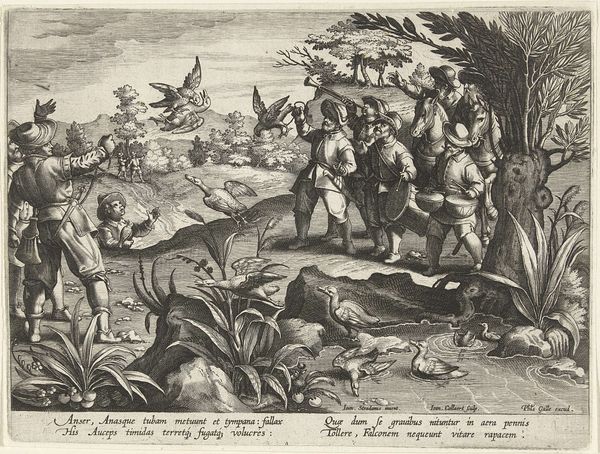 Editor: This is “Nederlaag van de soldaten uit Antemnae,” or “Defeat of the Soldiers from Antemnae,” an engraving made between 1572 and 1573 by Giovanni Battista Fontana, currently housed in the Rijksmuseum. There’s so much happening—the composition is packed, very chaotic and intense! What sort of historical narratives might be influencing its depiction? Curator: This is a perfect example of how even in depictions of battles, symbolic communication thrives! The imagery and visual weight really lend themselves to deeper readings of culture and memory. Look at how the archers in the foreground contrast with the city skyline in the distance. Do you notice the relationship being drawn? Editor: Yes! It creates a juxtaposition between immediate conflict and the stakes beyond the battlefield, doesn't it? The artist really layers a depth that speaks beyond a surface understanding. Curator: Exactly. Battles, historically and culturally, were seldom *just* about the skirmish. Consider how Fontana might be embedding messages about power dynamics, perhaps relating to the city, the forest and the act of war itself. Is one more civilized? Which controls the landscape? Editor: Hmm, I see your point. There’s a sense that the forest offers the warriors some cover and might offer an advantage over a flat plane in front of the walls of the city. So maybe Fontana highlights their struggle? Curator: Consider further, though. What meanings could be applied to shields and spears and arrows that could offer interpretations to what, ultimately, happened during this skirmish? Visual culture of this period imbued those objects with meanings beyond the practical. It might inform who emerges victorious and what the future holds for that cultural memory. Editor: That is such an astute way to read the image. I had only seen the chaos before, but seeing this through symbols helps to unlock greater cultural insights. Curator: Precisely. Engaging with this piece offers so much regarding how we construct, perceive, and perpetuate memory through images.