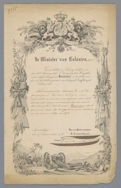 Curator: Here we have "Bewijs van ontslag" – or "Proof of Discharge" – by G.L. Lepeltak, possibly dating from 1825 to 1829. It appears to be a printed document with ink additions. Editor: It certainly has a feel of age. The toning of the paper and fading of the type suggest a physical object with a rich history. Curator: The overall structure is quite formal, wouldn’t you say? A carefully delineated border, a prominent coat of arms at the top, and meticulously organized columns of text give it an air of officialdom. Semiotically, we could view the framing as a boundary establishing authority and validity. Editor: Yes, but also control. Looking at the material reality, this document isn’t simply about an individual’s release. It is a carefully crafted object made to carry official weight using readily available means. This kind of printed paper made these records easier to process and distribute. How many similar papers might have existed, charting lives through military service? Curator: The visual language of the historical font evokes a specific time and place, reinforcing a sense of heritage. The "golden font" ai tag hints at an aspirational, almost idealized portrayal of duty. Editor: But the tea stains and what look like watermarks remind us of the unpredictable lives these documents experienced outside pristine archives. These papers are the physical output of specific modes of governance and military structuring of society. Each mark signifies how social conditions transformed the paper. Curator: That's true; these aging marks provide a certain character. So, considering its construction, the symmetrical elements communicate order and legality, whilst the imperfections tell us much about the impact of history on everyday existence. Editor: Exactly. "Proof of Discharge" invites us to think not only about individual cases, but about the structures of power and modes of communication and consumption involved in its creation, dissemination and endurance. Curator: It’s remarkable how a seemingly simple piece of paper encapsulates such rich meaning through both its design and material presence. Editor: A testament to art as process and the layering of significance.