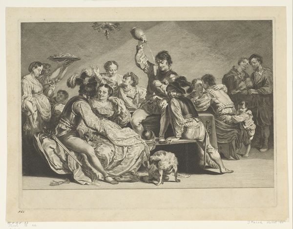 Curator: The balance of light and dark here is remarkable. Editor: Indeed. We're standing before Étienne Gantrel's engraving, "Mozes wordt gevonden," or "The Finding of Moses." Dating from between 1656 and 1706, this print on paper vividly illustrates a key moment from the Book of Exodus. Curator: The composition pulls you right in, doesn't it? That strong diagonal leading to the figures clustered around the infant Moses... Editor: Absolutely. I am struck by the conditions in which engravings like this were produced and circulated. This print would have allowed broader access to the narrative, wouldn't it, far beyond those who could afford paintings? This democratizing element seems crucial when evaluating such works. What do you make of the formal staging here? It appears less spontaneous, more classically staged. Curator: That's an astute point. There is a deliberate theatricality in the figures’ poses and the detailed rendering of the drapery—note how they lead the eye across the scene, adding a sense of dynamism. The artist invites close examination of how he orients the landscape to reinforce emotional content. Editor: And, let’s not forget the material reality. The use of paper, the labor invested in carving those lines…these prints served as a key vehicle for disseminating not only religious narratives but also, and very subtly, aesthetic and class values within 17th- and 18th-century European society. Curator: A complex dance between the intrinsic artistic vision and broader social and cultural currents then. Editor: Precisely. It shows how an ostensibly religious work becomes implicated in a web of power and influence through its means of production and consumption. It invites a reading against the grain. Curator: It enriches how we see Gantrel’s "Finding of Moses," moving it from a simple biblical illustration into a layered piece ripe for modern critical analysis. Thank you!